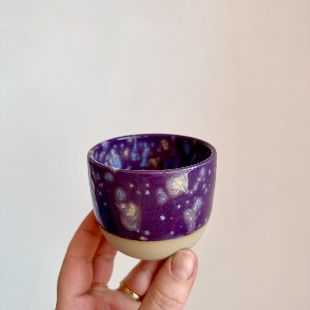 Ahoj, já fialkový hrnek na kávu s modrými kaňkami.