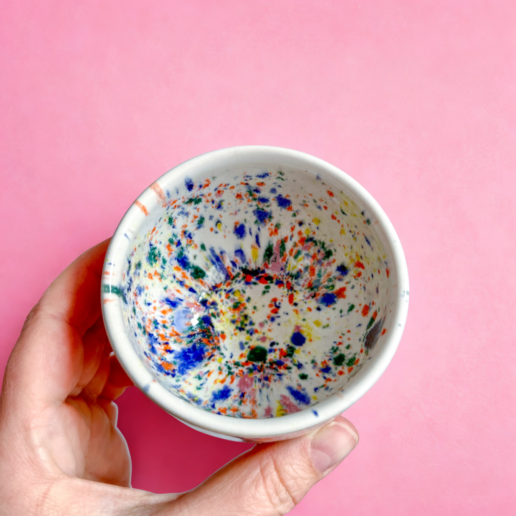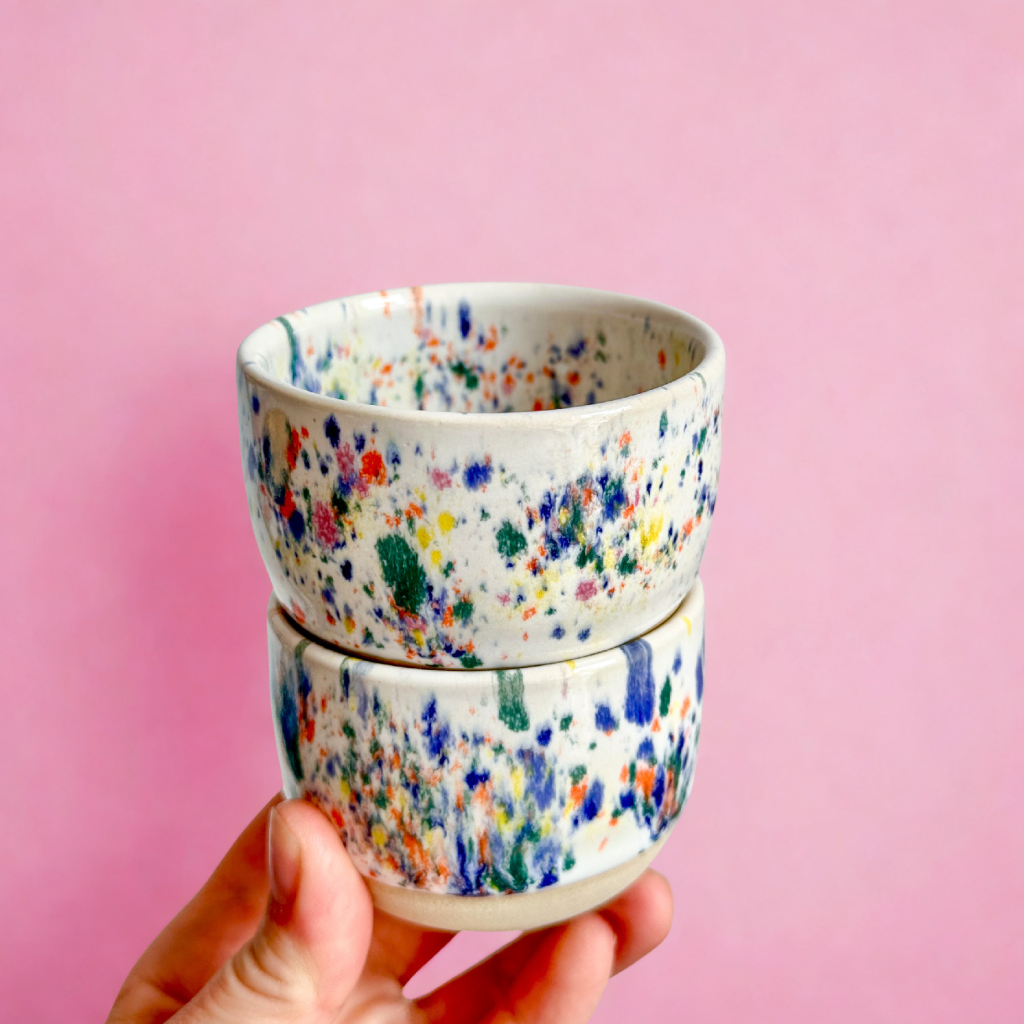 Ahoj, já jsem bílý hrnek na kávu s jemnými barevnými tečkami.