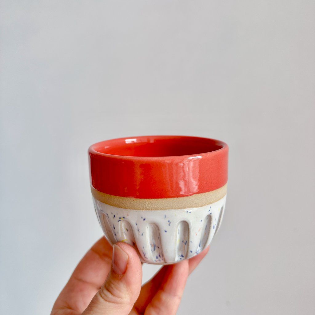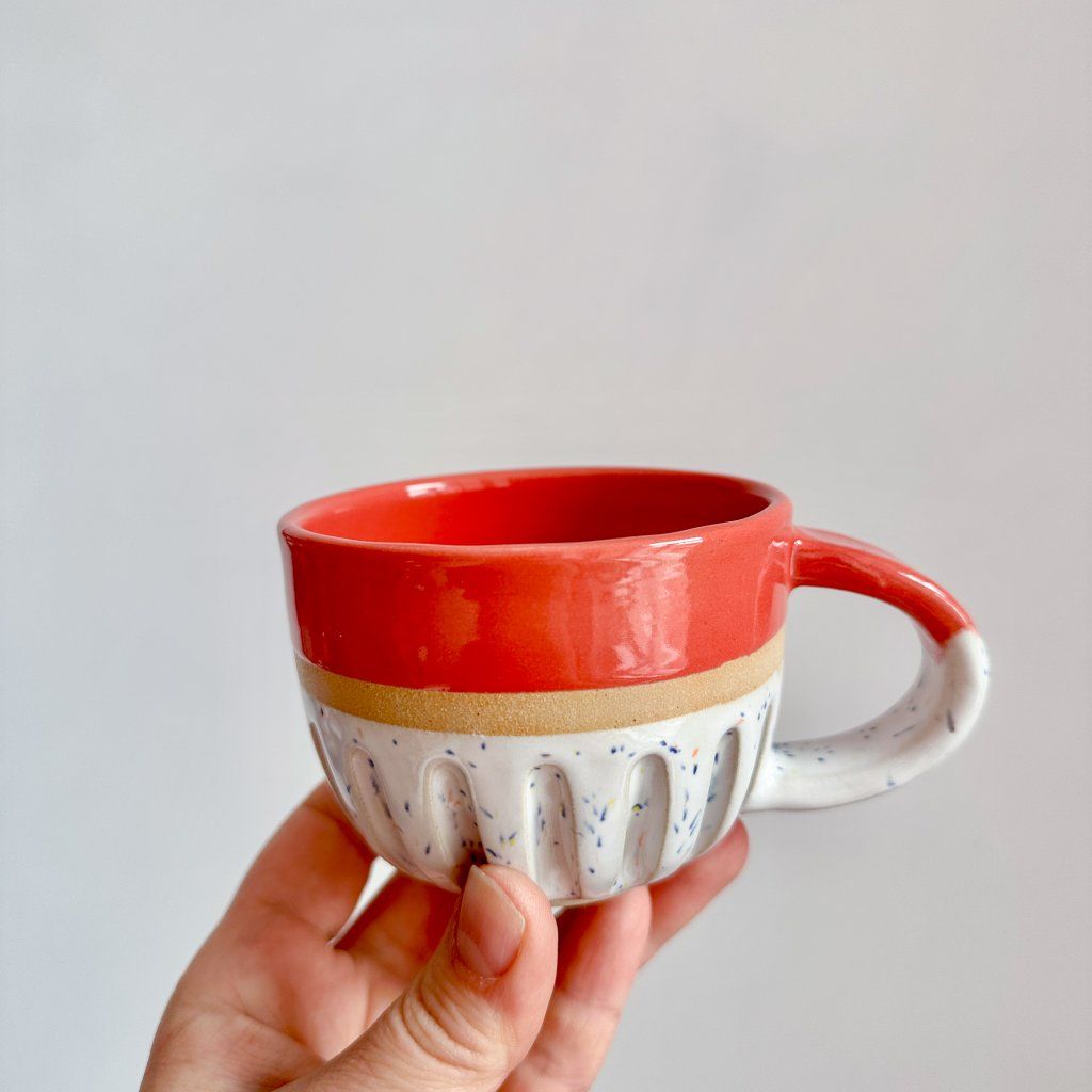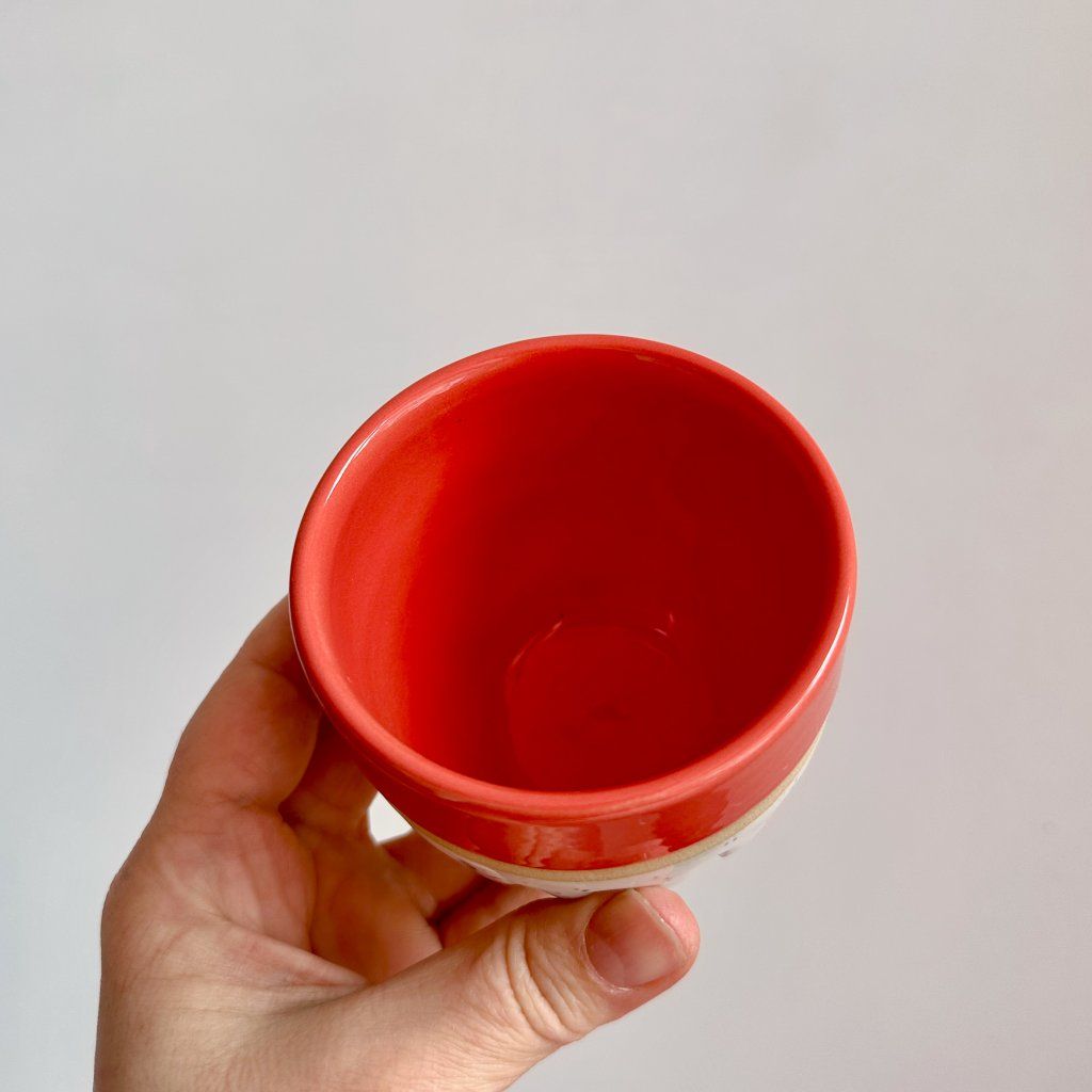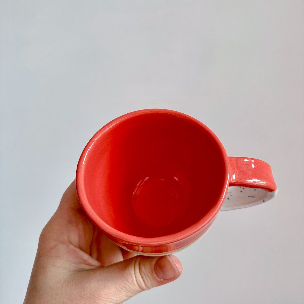 Ahoj, já jsem kaňkový hrnek na kávu se světle červeným okrajem a vnitřkem.