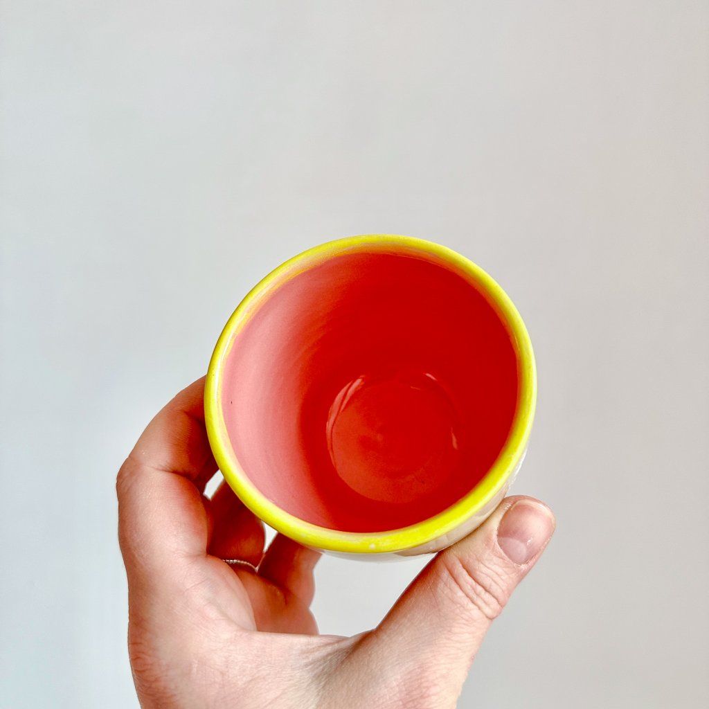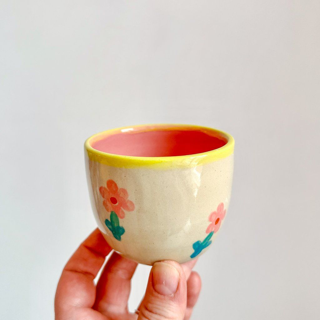 Ahoj, já jsem jemný kytičkový hrnek, uvnitř najdeš růžovou glazuru.