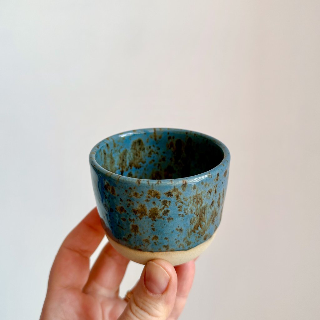 Ahoj, já jsem ocelovo modrý hrnek s hnědými skvrkami.