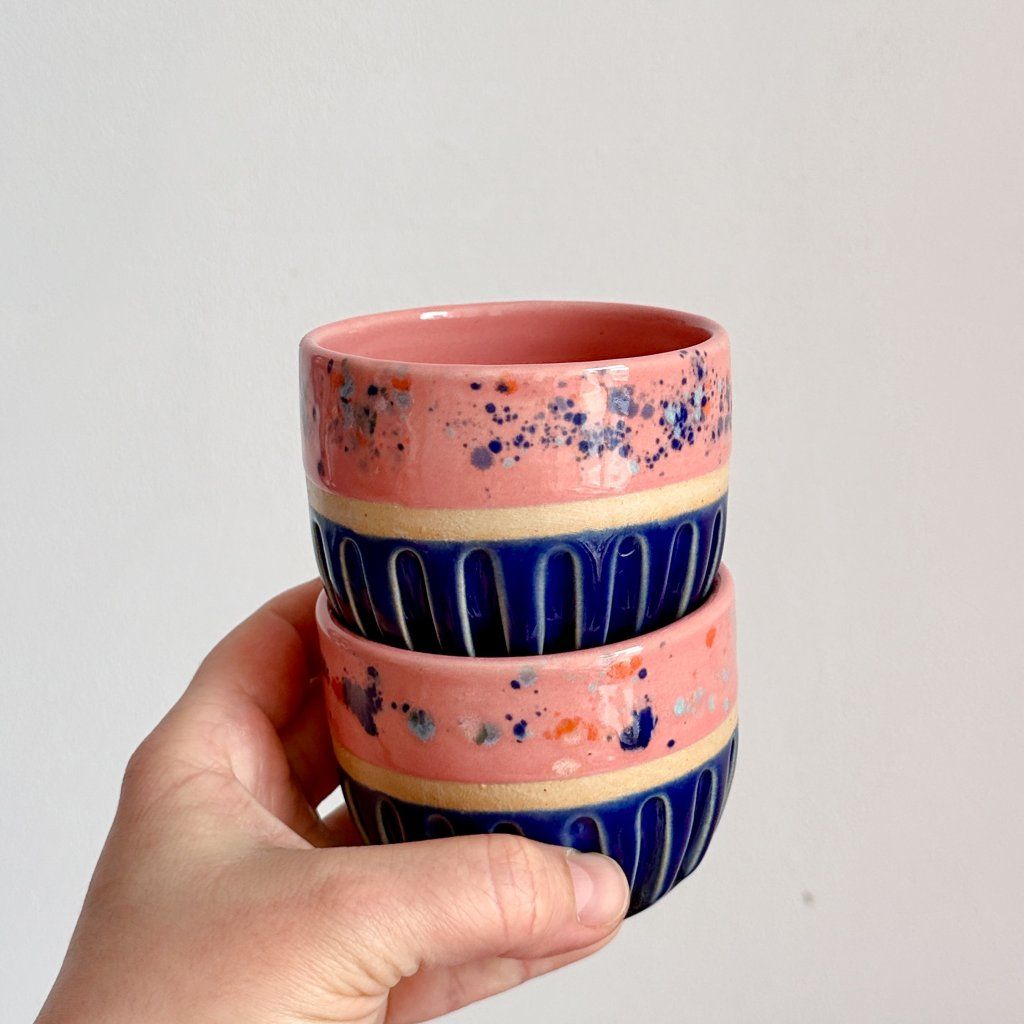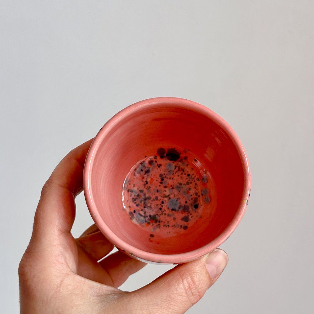 Ahoj, já jsem tmavěmodrý hrnek na kávu s růžovým okrajem a vnitřkem.