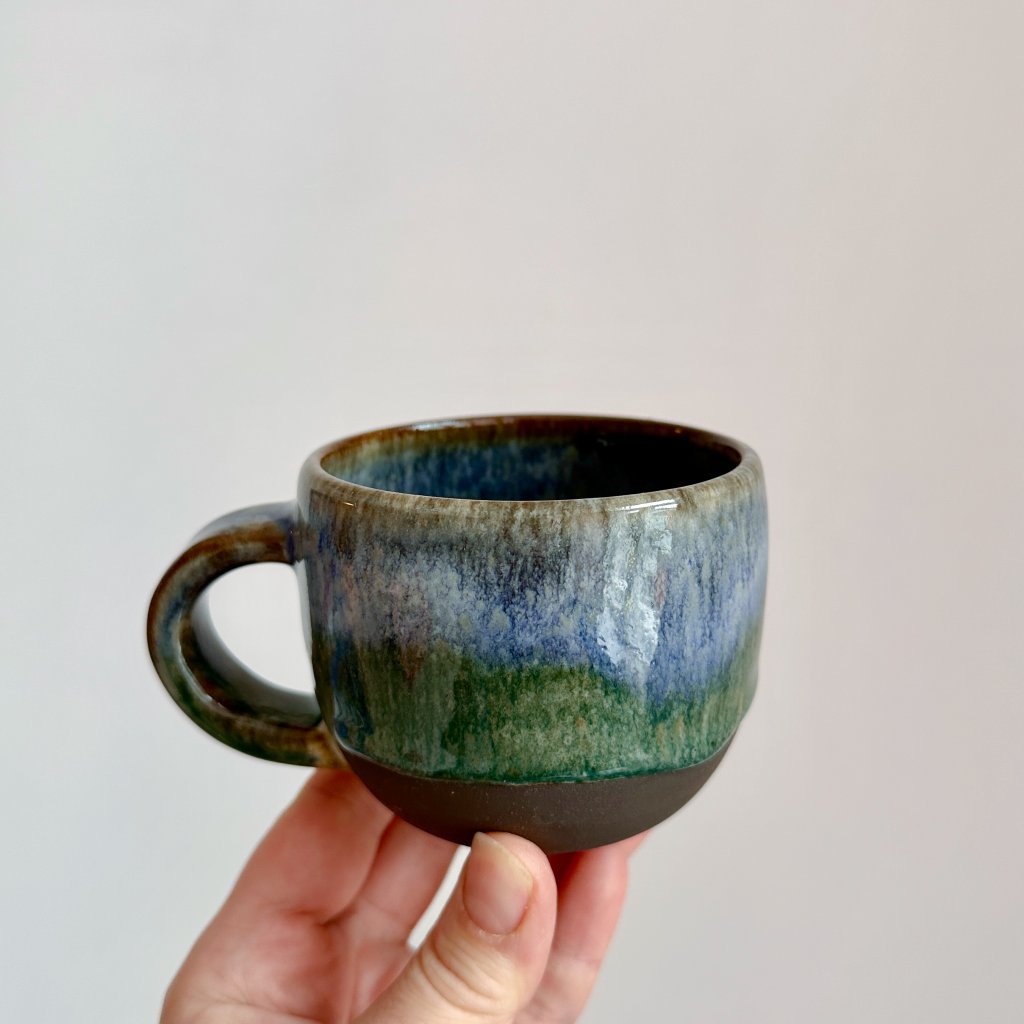 Ahoj, já jsem modrozelený hrnek z hladké hnědé kameniny.