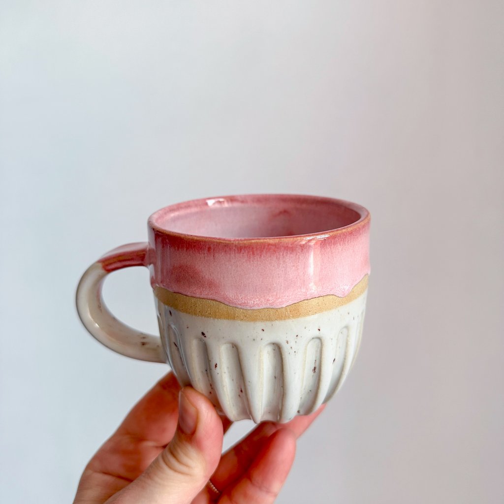 Ahoj, já jsem kaňkový hrnek na kávu s růžovým okrajem.
