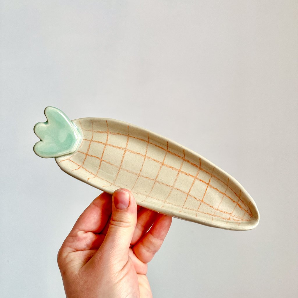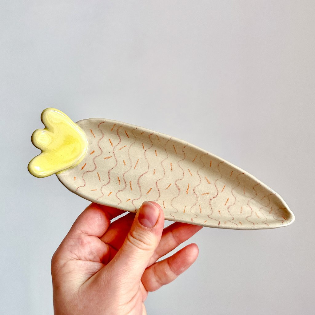 Ahoj, já jsem roztomilý keramický talířek ve tvaru mrkvičky. Jsem ideální na drobné dobroty, sušenky ke kávě, čajové sáčky nebo třeba šperky na nočním stolku.
