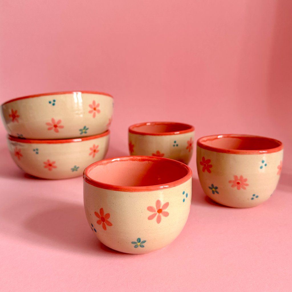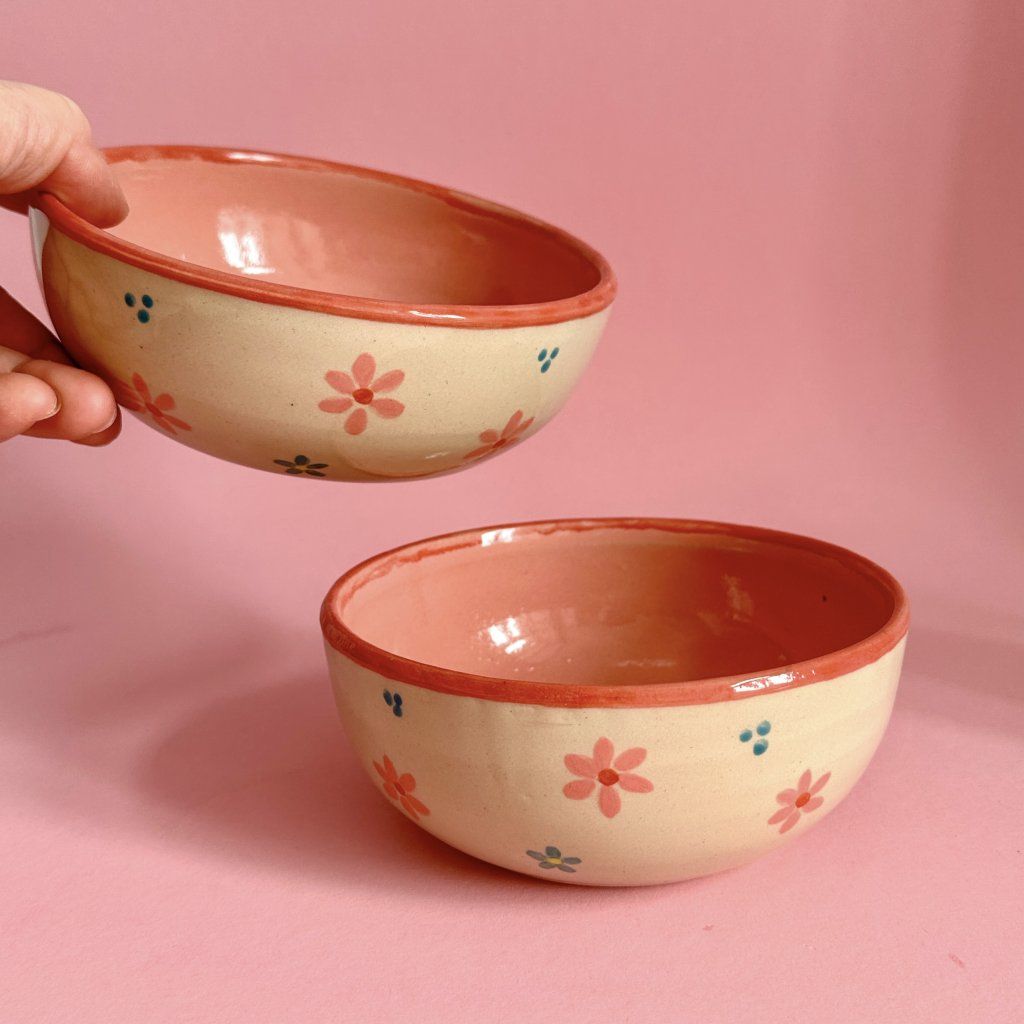 Ahoj, já jsem střední miska s malovanými kytičkami, uvnitř mě najdeš růžovou glazuru.
