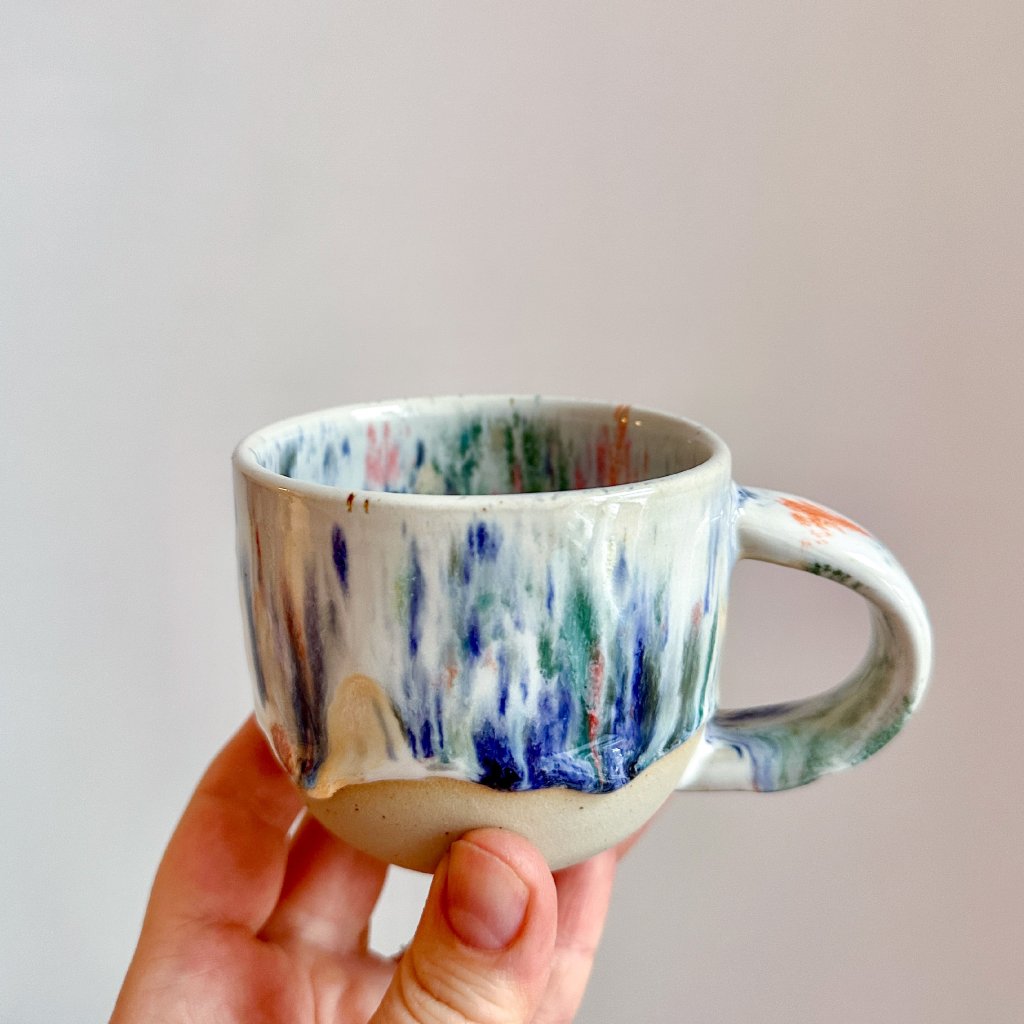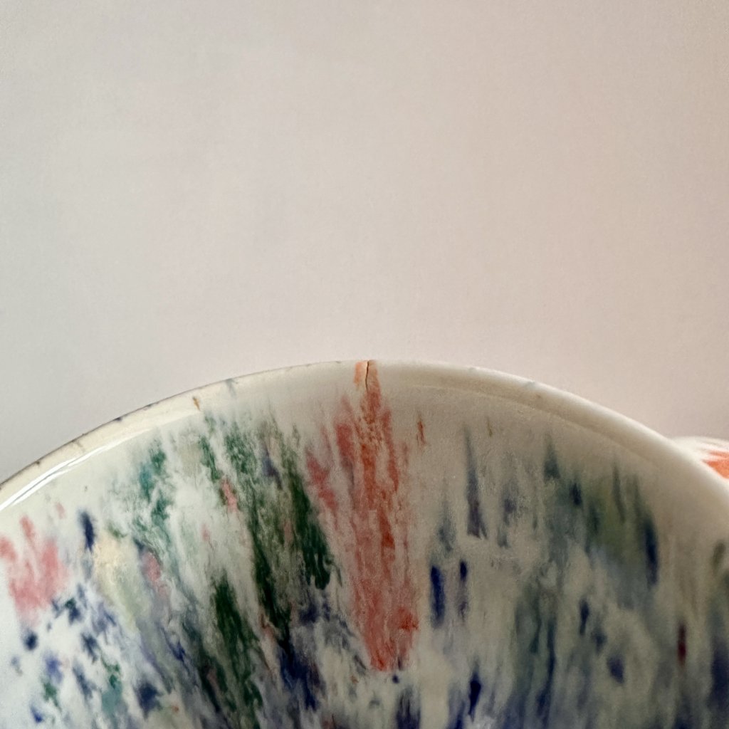 Ups… tady se to v peci trochu zvrtlo. Glazura sice nádherně hrála barvami, ale při výpalu nám hrnek trošku praskl u horního okraje.